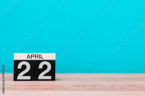 April 22nd. Day 22 of month, calendar on wooden table and turquoise background. Spring time, empty space for text