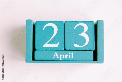 April 23. Blue cube calendar with month date isolated on white background.
