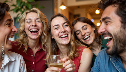 April Fool's Day. Joyful friends laughing together in casual indoor setting, fun vibes