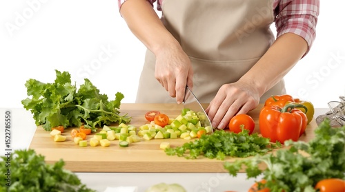 Aproned cook dicing fresh vegetables: peppers, tomatoes, herbs, on wooden board, close-up.