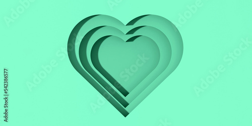 Aquamarine hearts with shadows. heart-shaped grooves with shadows. Valentine's Day. Horizontal image. Banner for insertion into site. 3D image. 3d rendering.