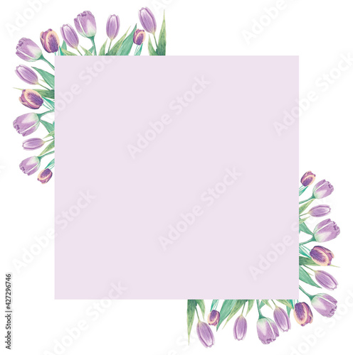 Aquarelle floral copy space frame with flowers. Watercolor hand painted square greeting card for wedding, easter, birthday, holidays. Frame with purple tulips.
