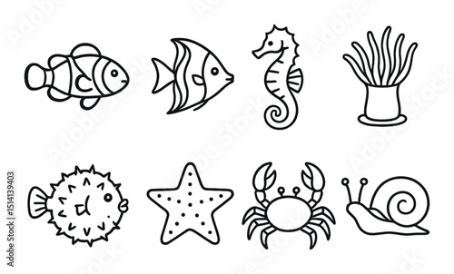 Aquarium and sea life silhouette icons set – marine, aquatic and ocean animal symbols