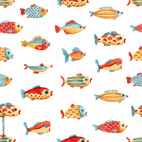 Aquarium fish seamless watercolor pattern. Decorative ornament in folk style. Fashionable print for your textile, packaging, home decor. Handmade.