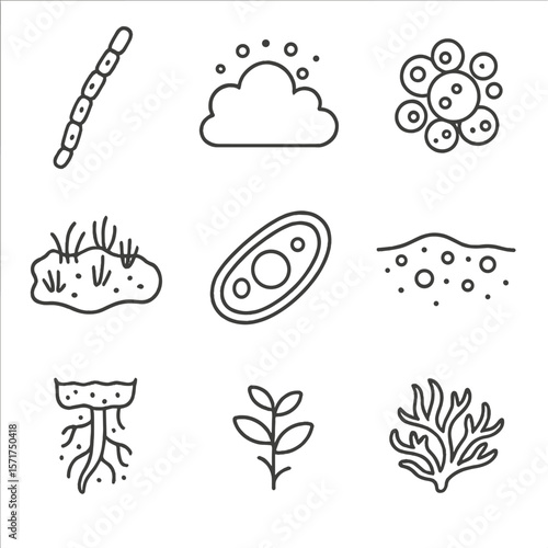 Aquatic Algae Icons. Outline style icons of Algae and Microflora: filamentous algae line, algae bloom cloud, pond scum cluster,