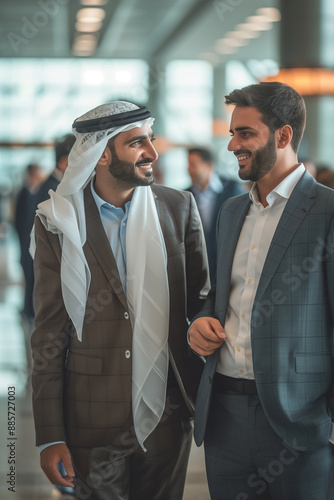 Arab business men talking together in the airport.