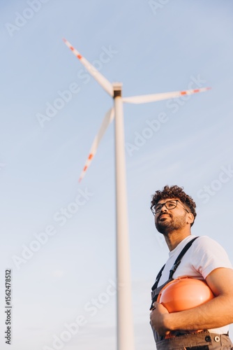 Arab engineer holding helmet looking up at wind turbine for sustainable energy