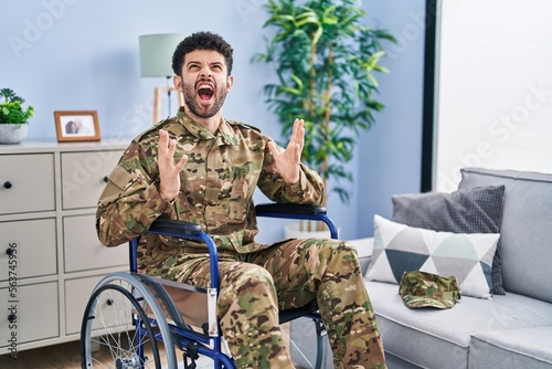 Arab man wearing camouflage army uniform sitting on wheelchair crazy and mad shouting and yelling with aggressive expression and arms raised. frustration concept.