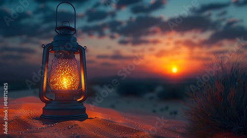 Arabian lanterns in the desert at dusk. suitable for the background of Ramadan celebrations and Eid greetings.