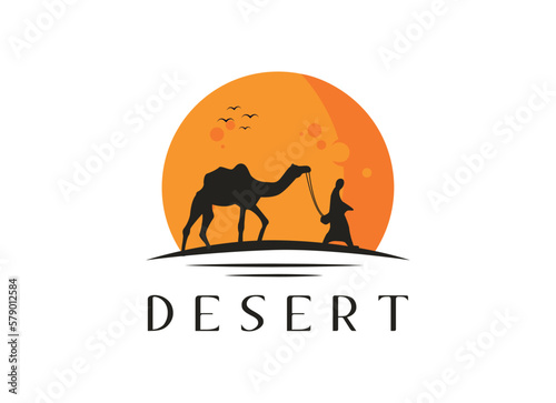 Arabian Logo caravan Camels in desert dunes on beige color gold sand under hot sun in circle wavy pattern background.Design template icon,badge, pictogram,symbol,tourism sign,travel,hot places.Vector