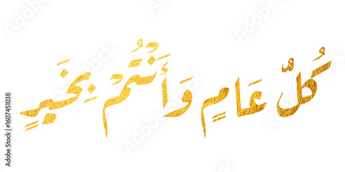 Arabic Calligraphy greeting for Eid. translated: May you be well every year(Kullu-Am-Wa-Antum-Bikhair)! Creative Islamic calligraphy type for Eid Mubarak Celebration