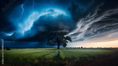 arafed tree in a field with a lightning bolt in the background Generative AI