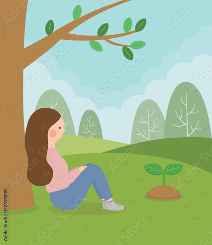 Arbor Day illustration with a girl leaning on a tree and sprouts