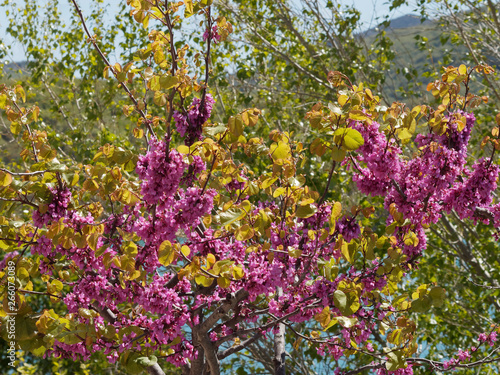 Arbre de Judée ou Gainier silicastre 'Cercis siliquastrum' aux feuilles rondes et fleurs rose pourpre
