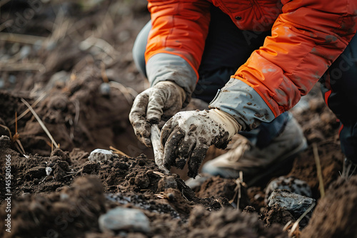 Archaeologist Carefully Excavating Fossilized Artifact Bones Skeletons in Field, Generative AI