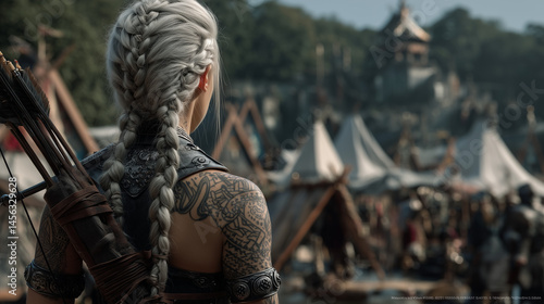 Archer Viking Woman in Braided Hair Facing Medieval Market