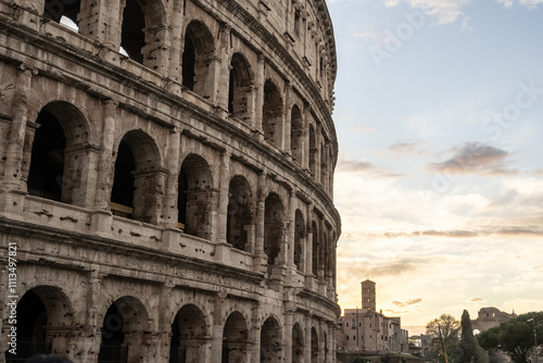 Arches archictecture of Colosseum (Colosseo) exterior with clouds and sky. Rome, Italy.