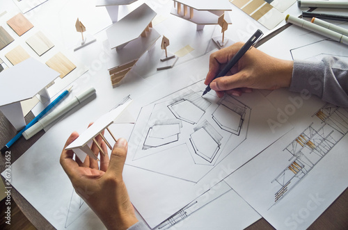 architect design working drawing sketch plans blueprints and making architectural construction model in architect studio