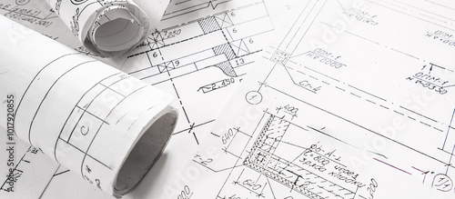 architect design working drawing sketch plans blueprints and making architectural construction model in architect studio,flat lay.