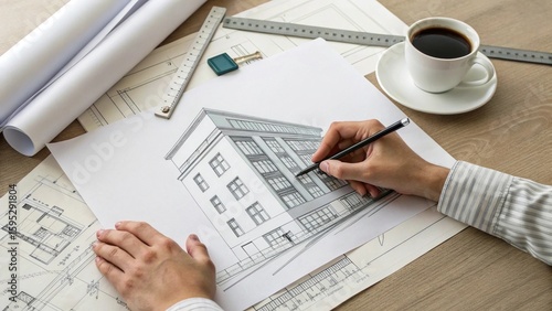 Architect Drawing Modern Building Design with Blueprints and Coffee on Desk