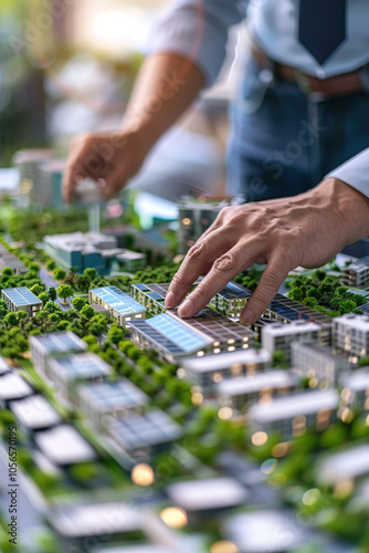 Architect presenting a 3D model of a sustainable city, green roofs and solar panels highlighted