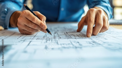 Architect reviewing blueprints, meticulously checking details with a pencil. Precise planning and design process.