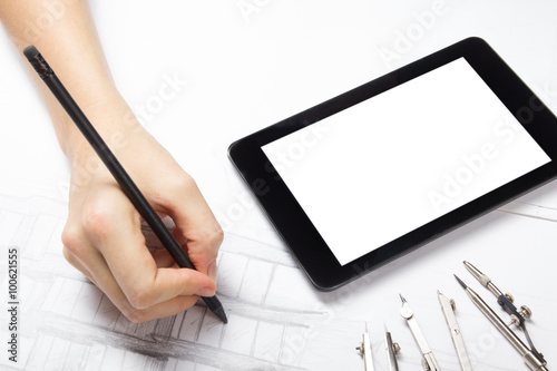 Architect working on blueprint. Architects workplace - architectural project, blueprints, ruler, calculator, laptop and divider compass. Construction concept. Engineering tools