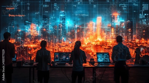 Architects collaborating in a digital studio designing a futuristic urban landscape on a massive holographic projection