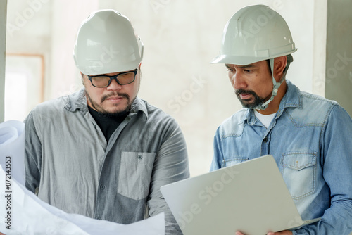 Architects, designers and engineers staff Manager, foreman, Asian male Stand holding notebook consult building plans prevent stress home structure Wearwhite safety helmet prevent things from falling.