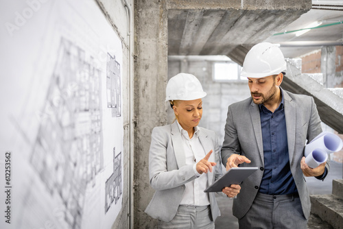 Architects having a construction site meeting about the new project building.