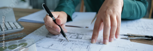 Architects interior designer hands working with Blue prints and documents for a home renovation for house design