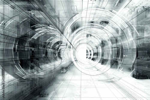 Architectural blueprint sketch in stark black and white, showcasing futuristic structures with intricate wireframes and subtle holographic accents