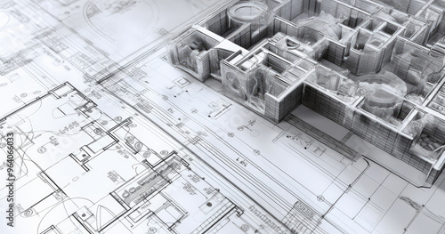 Architectural Blueprint with 3D Model Concept