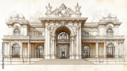 Architectural drawing of an ornate building facade.