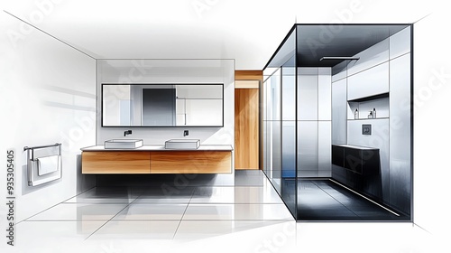 Architectural hand-colored sketch of a bathroom interior, focusing on detailed fixtures and subtle shading, with a modern design influence, copy space for text,