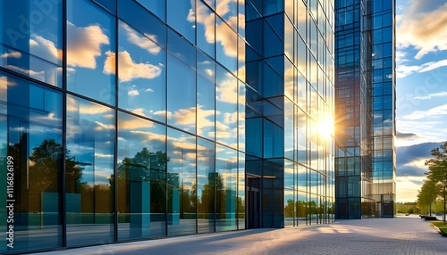 Architectural Image of Sleek Glass Skyscrapers with Glowing Sunset Reflections and a Polished Urban Design