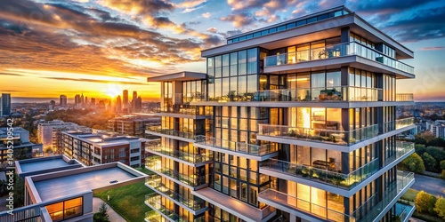 Architectural Marvel at Sunset: Luxurious modern building design with stunning views in the heart of city, framed by an artistic sunset.