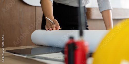 Architectural Planning and Collaboration. A hand holding a blueprint on a desk, indicating careful planning in a creative workspace.