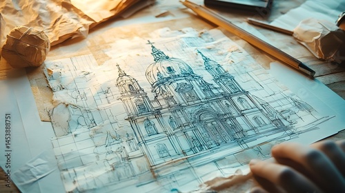 Architectural sketch of a grand church with a dome and intricate details displayed on a paper with grid lines and some