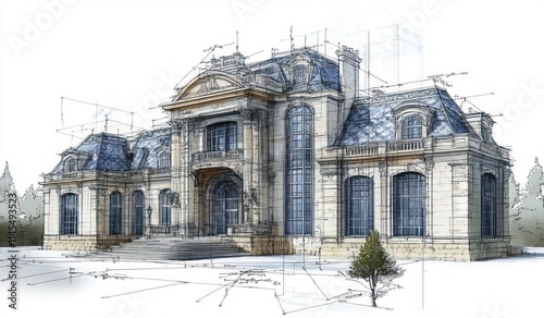 Architectural sketch of an elaborate mansion with detailed design elements.