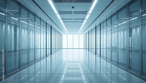 Architectural Symmetry, A luminous, clean interior space with glass walls