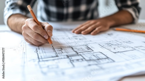 Architectural Vision: A close-up image of an architect's hand meticulously drawing plans for a new construction project with a pencil.