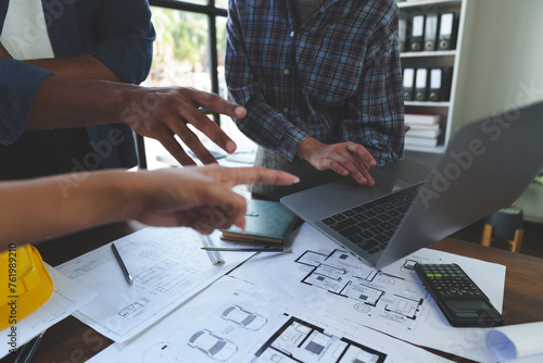 Architecture Engineer Teamwork Meeting, Drawing and working for Architectural projects and engineering tools in the workplace, working ideas on architectural structures.