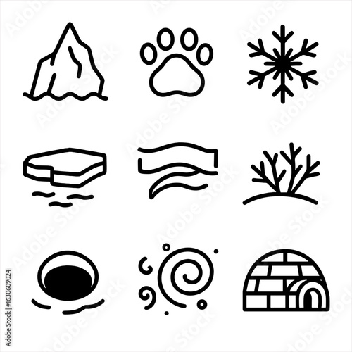 Arctic Wilderness Icons. Line style icons of Arctic Wilderness Features: iceberg peak, polar bear track, snowflake crystal, ice