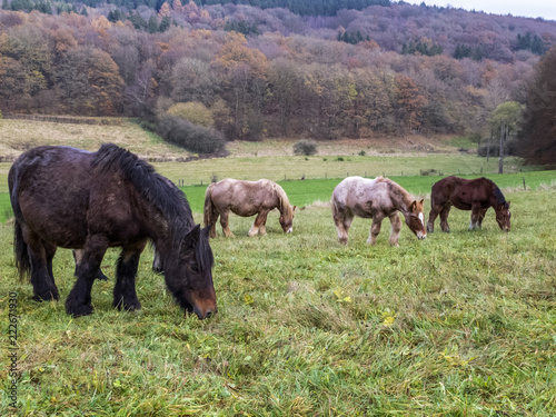 Ardennes mares and foals grazing in a Belgian pasture on a rainy November day