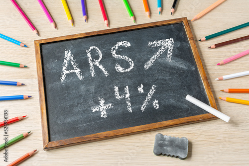 Ardoise avec texte "ARS + 4 % " et crayons de couleurs. Augmentation de l'Allocation de Rentrée Scolaire.