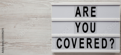'Are you covered?' words on a lightbox on a white wooden background, top view. Overhead, from above, flat lay. Copy space.