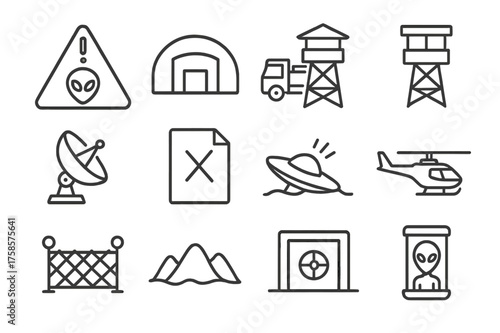 Area Icon Set. Area . Line icon set of Area : warning sign, hangar, military truck, guard tower, radar dish, secret document, UFO crash site, black helicopter,