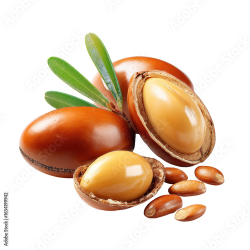 Argan nuts and seeds displayed with leaves on a white background for an illustrative composition