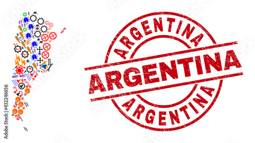 Argentina map mosaic and dirty Argentina red round stamp print. Argentina seal uses vector lines and arcs. Argentina map mosaic includes gears, homes, lamps, suns, hands, and more pictograms.